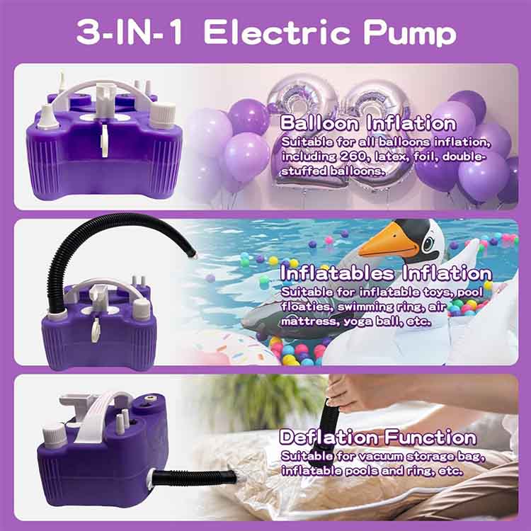 이 전기 풍선 펌프는 하나의 4 가지 기능을 제공합니다. 효율적인 풍선 팽창기 일뿐 만 아니라 풍선 장난감/가정 용품에 대한 매우 빠른 불타인, 진공 저장 백을위한 지능형 진공 펌프 및 스포츠 볼을위한 전문 공기 펌프입니다. 파티 장식에서 야외 캠핑, 홈 스토리지에서 스포츠 및 피트니스에 이르기까지 하나의 장치는 모든 장면 요구 사항을 다루고 공간을 절약하고 예산을 절약합니다.