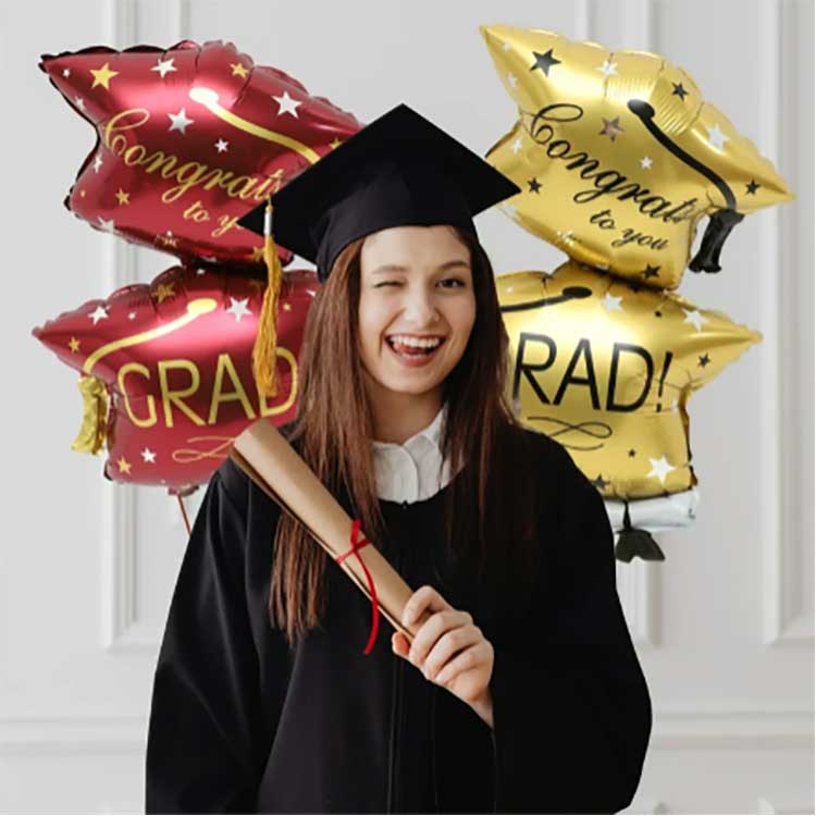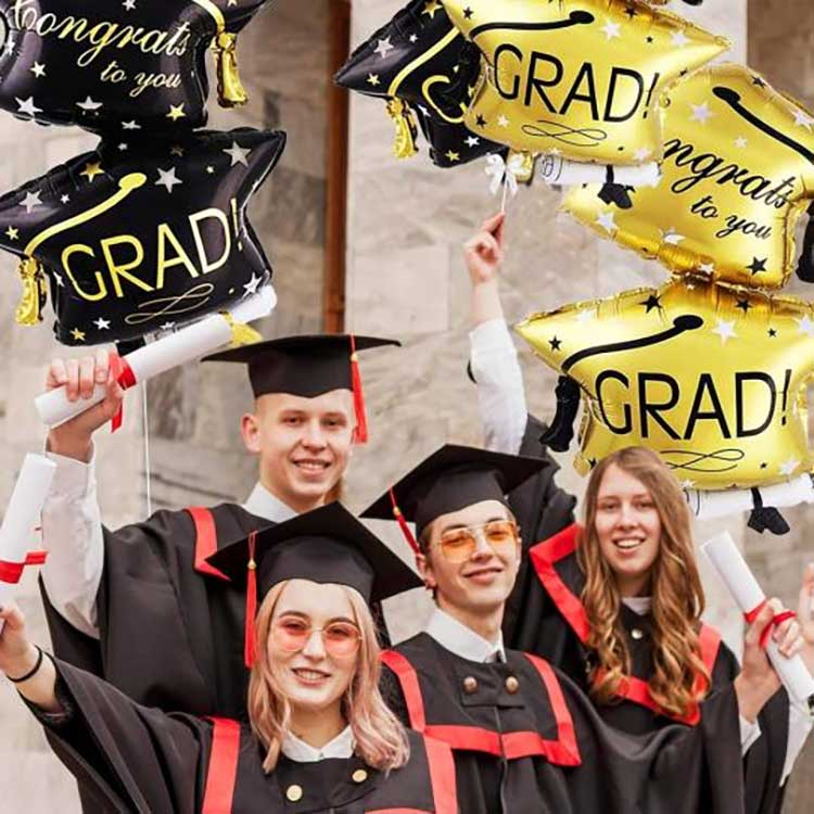 32인치 졸업 모자 풍선 세트는 18미크론 두께의 고품질 알루미늄 도금 PET 필름으로 만들어졌습니다. 이 필름은 탄력성이 뛰어나고 완전하고 푹신하게 팽창하며 압축 및 충격에 강하므로 학교 및 이와 유사한 장소에 적합합니다. 우리는 인쇄에 환경 친화적인 잉크를 사용하여 색이 바래지 않고 생생하고 균일한 색상을 인쇄합니다. 야외 졸업식 등 몇 시간 동안 직사광선에 노출된 후에도 패턴과 색상이 여전히 선명하게 유지됩니다.