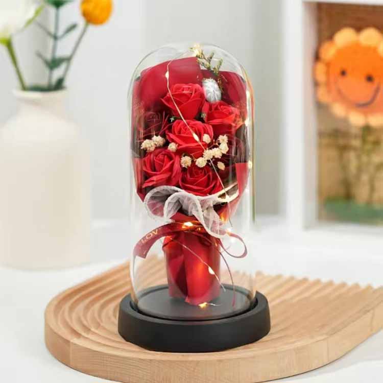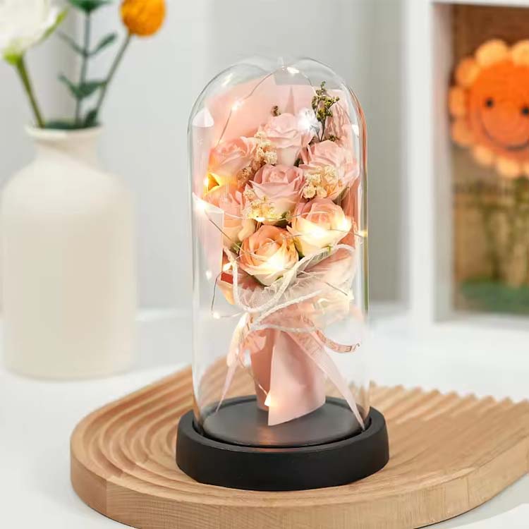 커버 재질: 우리는 맞춤 제작할 수 있는 비누 장미 부케가 포함된 유리 및 PVC 갓을 제공합니다.귀하의 필요에 맞게 조정되었습니다. 붕규산 유리, 조화, 천연 나무로 제작되었습니다.