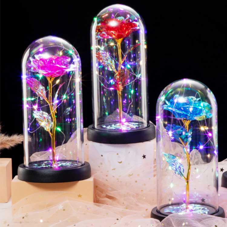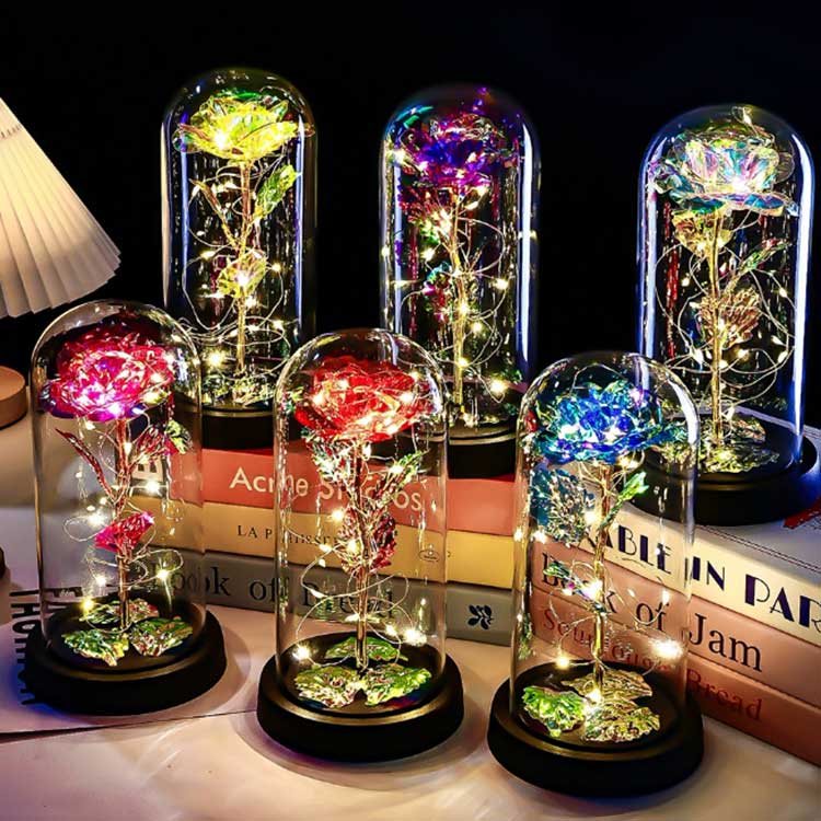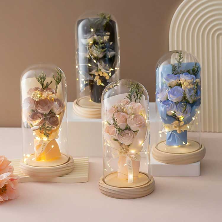 고급 유리와 환경 친화적인 원목으로 만든 유리꽃은 고급 유리와 플라스틱 베이스와 함께 장인의 손으로 직접 제작한 꽃으로, 유리 돔 안에 꽃이 배열되어 있습니다. 햇빛이 유리를 통해 빛나면 꽃의 색깔이 굴절되어 독특한 로맨틱함과 놀라움을 선사합니다.