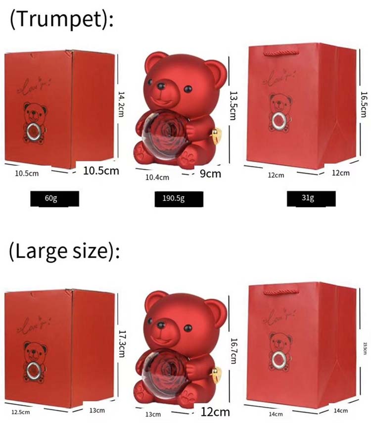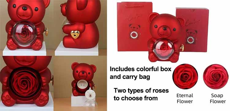 각 곰 인형에는 자체 아크릴 상자가 함께 제공됩니다. 목걸이, 반지, 손으로 쓴 러브레터 등 사랑하는 사람을 위한 작은 서프라이즈 선물로 적합합니다! 사랑하는 사람을 상자에 넣고(저희 제품은 깜짝 곰입니다. 목걸이나 반지 선물을 직접 준비해야 합니다) 행복에 빠져들게 해주세요!
