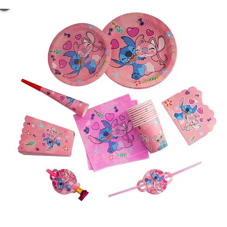 스티치 일회용 접시 세트에는 7인치 접시(10개/가방), 9인치 접시(10개/가방), 냅킨(20개/가방), 페넌트(10개/가방), 답례봉투(10개/가방), 팝콘박스(6개/가방), 부는 용(6개/가방), 종이모자(6개/가방), 종이컵(10개/가방), 뿔(6개/가방), 빨대(10개/가방), 초대장(10개/가방), 마스크(10개/가방), 숟가락, 수저(10개/가방), 식탁보(1개/가방). 세트에는 17가지의 다양한 제품 유형이 포함되어 있습니다. 고객은 전체 세트를 구매하거나 필요에 맞게 일부 품목만 선택할 수 있습니다.